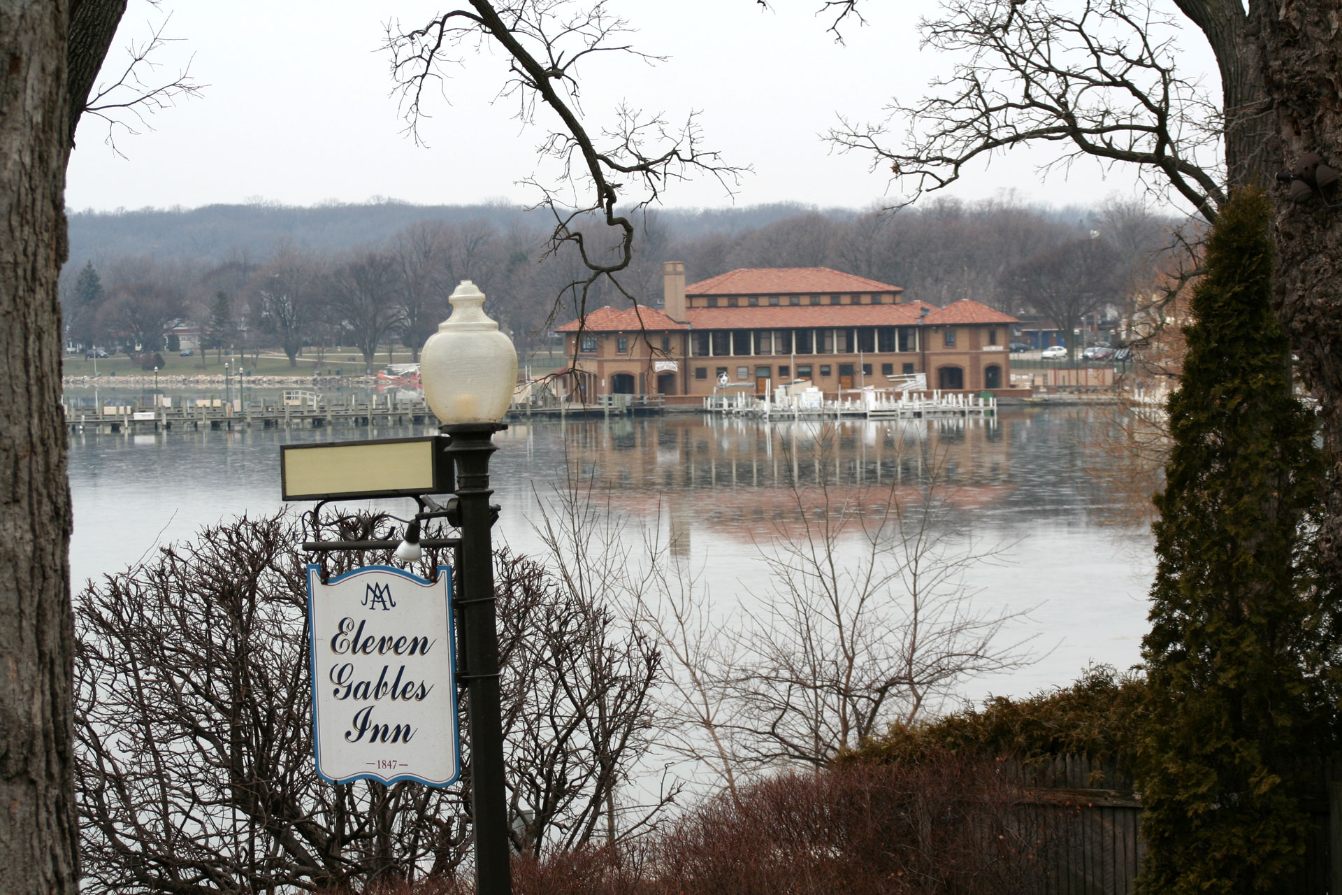An Authentic Carpenter’s Gothic lake house as a boutique inn located three blocks from downtown Lake Geneva,Wisconsin. The property has a private pier in the very clean waters of Geneva Lake; you can see the bottom down to 12 feet when the wind is calm. In the State of Wisconsin the first homes where always built on the southeast shores, so as to catch the south westerly winds coming across the waters. When the wind came out of the north in the summer they were generally cooler, thus Eleven Gables is located on the southeast shore to capture the winds of summer.